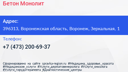 Бетон-Монолит по адресу 396313, Воронежская область, Воронеж, Зеркальная, 1 в дальнейшем Организация, размещена в следующих категориях:
