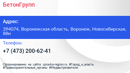 БетонГрупп по адресу 394074, Воронежская область, Воронеж, Новосибирская, 88и в дальнейшем Организация, размещена в следующих категориях: