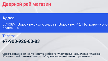 Дверной рай, магазин по адресу 394089, Воронежская область, Воронеж, 41 Пограничного полка, 1а в дальнейшем Организация, размещена в следующих категориях: