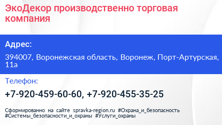 ЭкоДекор, производственно-торговая компания по адресу 394007, Воронежская область, Воронеж, Порт-Артурская, 11а в дальнейшем Организация, размещена в следующих категориях: