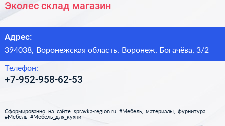 Эколес, склад-магазин по адресу 394038, Воронежская область, Воронеж, Богачёва, 3/2 в дальнейшем Организация, размещена в следующих категориях: