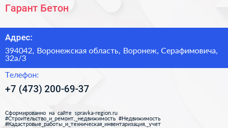 Гарант-Бетон по адресу 394042, Воронежская область, Воронеж, Серафимовича, 32а/3 в дальнейшем Организация, размещена в следующих категориях: