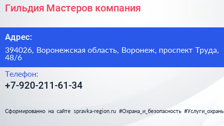 Гильдия Мастеров, компания по адресу 394026, Воронежская область, Воронеж, проспект Труда, 48/6 в дальнейшем Организация, размещена в следующих категориях: