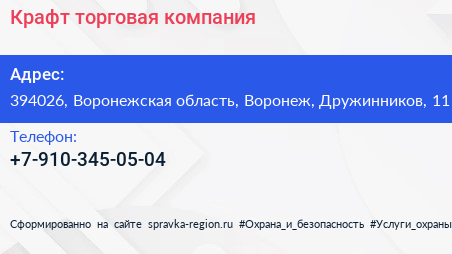 Крафт, торговая компания по адресу 394026, Воронежская область, Воронеж, Дружинников, 11 в дальнейшем Организация, размещена в следующих категориях: