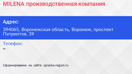 MILENA, производственная компания по адресу 394065, Воронежская область, Воронеж, проспект Патриотов, 39 в дальнейшем Организация, размещена в следующих категориях: