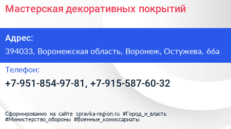 Мастерская декоративных покрытий по адресу 394033, Воронежская область, Воронеж, Остужева, 66а в дальнейшем Организация, размещена в следующих категориях: