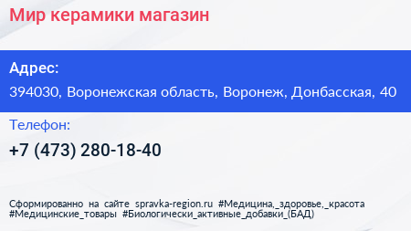 Мир керамики, магазин по адресу 394030, Воронежская область, Воронеж, Донбасская, 40 в дальнейшем Организация, размещена в следующих категориях: