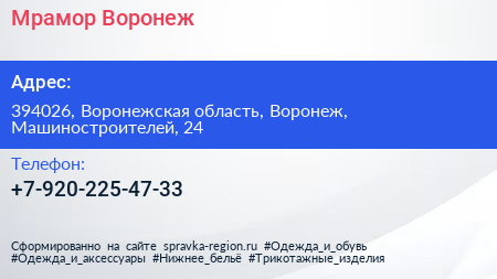 Мрамор-Воронеж по адресу 394026, Воронежская область, Воронеж, Машиностроителей, 24 в дальнейшем Организация, размещена в следующих категориях: