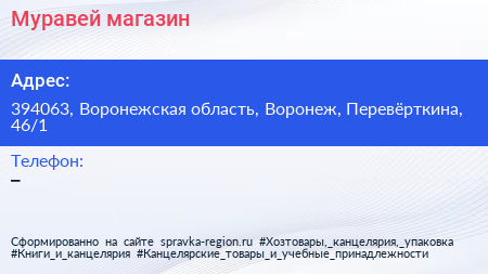 Муравей, магазин по адресу 394063, Воронежская область, Воронеж, Перевёрткина, 46/1 в дальнейшем Организация, размещена в следующих категориях: