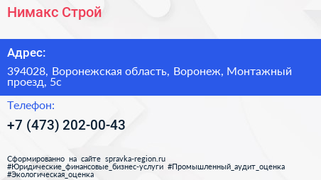 Нимакс-Строй по адресу 394028, Воронежская область, Воронеж, Монтажный проезд, 5с в дальнейшем Организация, размещена в следующих категориях: