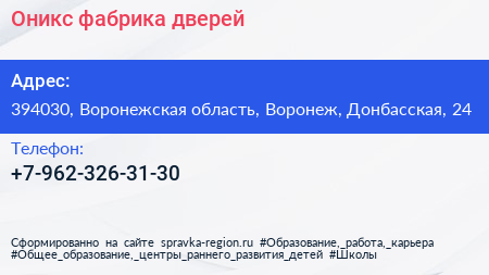 Оникс, фабрика дверей по адресу 394030, Воронежская область, Воронеж, Донбасская, 24 в дальнейшем Организация, размещена в следующих категориях: