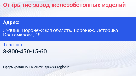 Открытие, завод железобетонных изделий по адресу 394088, Воронежская область, Воронеж, Историка Костомарова, 48 в дальнейшем Организация, размещена в следующих категориях: