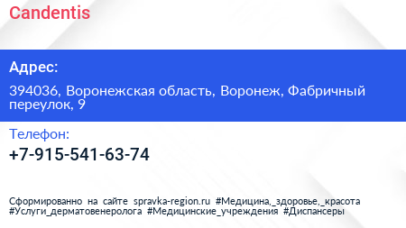 Сandentis по адресу 394036, Воронежская область, Воронеж, Фабричный переулок, 9 в дальнейшем Организация, размещена в следующих категориях: