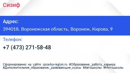Сизиф по адресу 394018, Воронежская область, Воронеж, Кирова, 9 в дальнейшем Организация, размещена в следующих категориях: