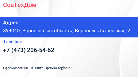 СовТехДом по адресу 394040, Воронежская область, Воронеж, Латненская, 2 в дальнейшем Организация, размещена в следующих категориях: