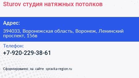 Sturov, студия натяжных потолков по адресу 394033, Воронежская область, Воронеж, Ленинский проспект, 156в в дальнейшем Организация, размещена в следующих категориях: