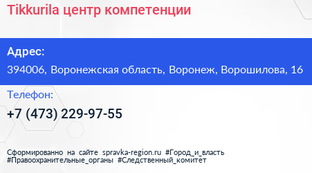 Tikkurila, центр компетенции по адресу 394006, Воронежская область, Воронеж, Ворошилова, 16 в дальнейшем Организация, размещена в следующих категориях: