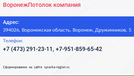 ВоронежПотолок, компания по адресу 394026, Воронежская область, Воронеж, Дружинников, 5 в дальнейшем Организация, размещена в следующих категориях: