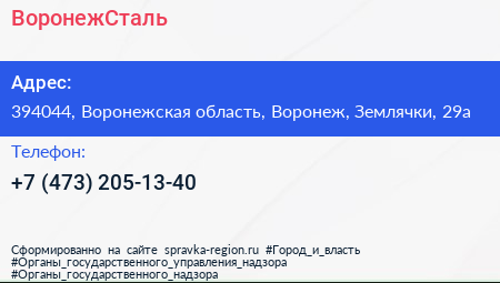 ВоронежСталь по адресу 394044, Воронежская область, Воронеж, Землячки, 29а в дальнейшем Организация, размещена в следующих категориях: