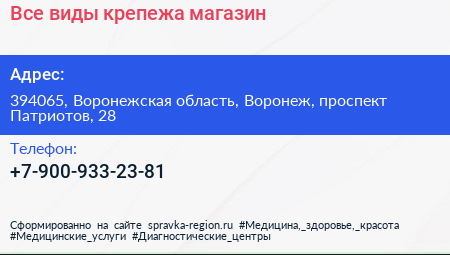 Все виды крепежа, магазин по адресу 394065, Воронежская область, Воронеж, проспект Патриотов, 28 в дальнейшем Организация, размещена в следующих категориях: