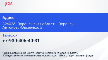 ЦСИ по адресу 394026, Воронежская область, Воронеж, Антонова-Овсеенко, 5 в дальнейшем Организация, размещена в следующих категориях: