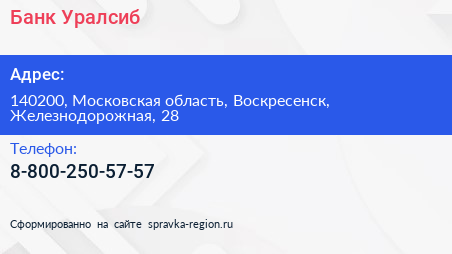 Банк Уралсиб по адресу 140200, Московская область, Воскресенск, Железнодорожная, 28 в дальнейшем Организация, размещена в следующих категориях:
