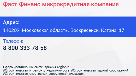 Фаст Финанс, микрокредитная компания по адресу 140209, Московская область, Воскресенск, Кагана, 17 в дальнейшем Организация, размещена в следующих категориях:
