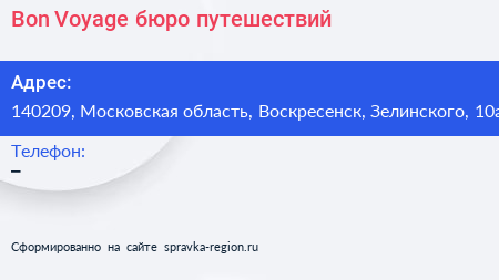 Bon Voyage, бюро путешествий по адресу 140209, Московская область, Воскресенск, Зелинского, 10а в дальнейшем Организация, размещена в следующих категориях: