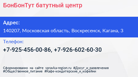 БонБонТут, батутный центр по адресу 140207, Московская область, Воскресенск, Кагана, 3 в дальнейшем Организация, размещена в следующих категориях: