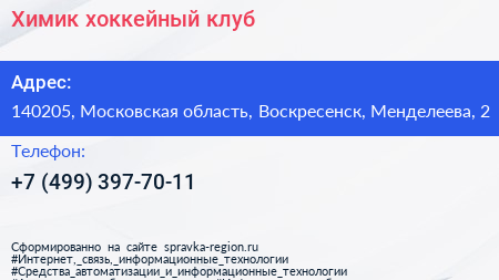 Химик, хоккейный клуб по адресу 140205, Московская область, Воскресенск, Менделеева, 2 в дальнейшем Организация, размещена в следующих категориях: