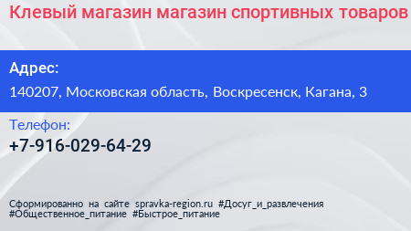 Клевый магазин, магазин спортивных товаров по адресу 140207, Московская область, Воскресенск, Кагана, 3 в дальнейшем Организация, размещена в следующих категориях: