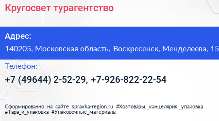 Кругосвет, турагентство по адресу 140205, Московская область, Воскресенск, Менделеева, 15 в дальнейшем Организация, размещена в следующих категориях: