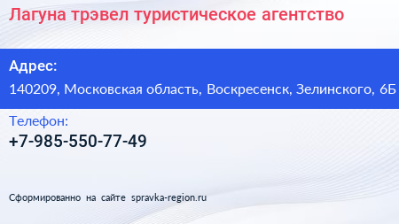Лагуна-трэвел, туристическое агентство по адресу 140209, Московская область, Воскресенск, Зелинского, 6Б в дальнейшем Организация, размещена в следующих категориях: