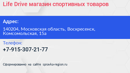 Life Drive, магазин спортивных товаров по адресу 140204, Московская область, Воскресенск, Комсомольская, 15а в дальнейшем Организация, размещена в следующих категориях: