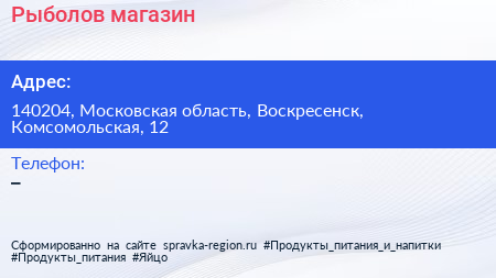 Рыболов, магазин по адресу 140204, Московская область, Воскресенск, Комсомольская, 12 в дальнейшем Организация, размещена в следующих категориях: