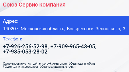 Союз-Сервис, компания по адресу 140207, Московская область, Воскресенск, Зелинского, 3 в дальнейшем Организация, размещена в следующих категориях:
