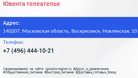 Ювента, телеателье по адресу 140207, Московская область, Воскресенск, Новлянская, 10 в дальнейшем Организация, размещена в следующих категориях: