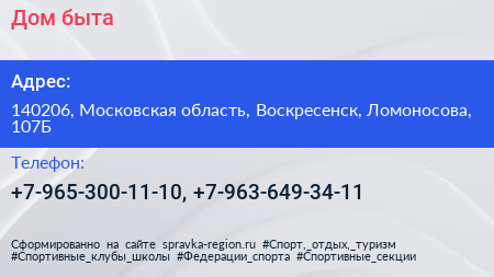 Дом быта по адресу 140206, Московская область, Воскресенск, Ломоносова, 107Б в дальнейшем Организация, размещена в следующих категориях: