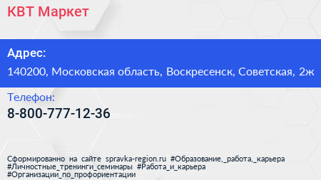 КВТ Маркет по адресу 140200, Московская область, Воскресенск, Советская, 2ж в дальнейшем Организация, размещена в следующих категориях: