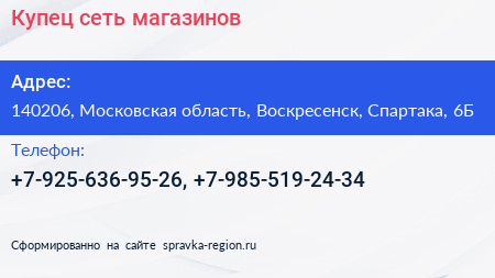Купец, сеть магазинов по адресу 140206, Московская область, Воскресенск, Спартака, 6Б в дальнейшем Организация, размещена в следующих категориях: