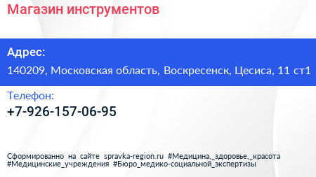 Магазин инструментов по адресу 140209, Московская область, Воскресенск, Цесиса, 11 ст1 в дальнейшем Организация, размещена в следующих категориях: