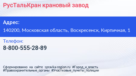 РусТальКран, крановый завод по адресу 140200, Московская область, Воскресенск, Кирпичная, 1 в дальнейшем Организация, размещена в следующих категориях: