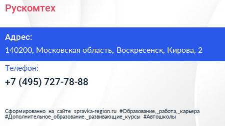 Рускомтех по адресу 140200, Московская область, Воскресенск, Кирова, 2 в дальнейшем Организация, размещена в следующих категориях: