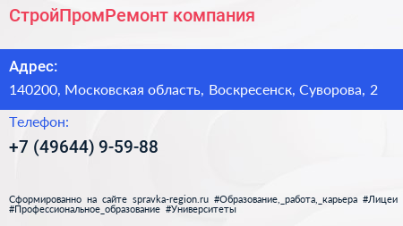 СтройПромРемонт, компания по адресу 140200, Московская область, Воскресенск, Суворова, 2 в дальнейшем Организация, размещена в следующих категориях: