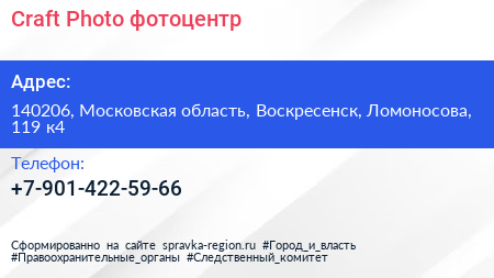 Craft Photo, фотоцентр по адресу 140206, Московская область, Воскресенск, Ломоносова, 119 к4 в дальнейшем Организация, размещена в следующих категориях: