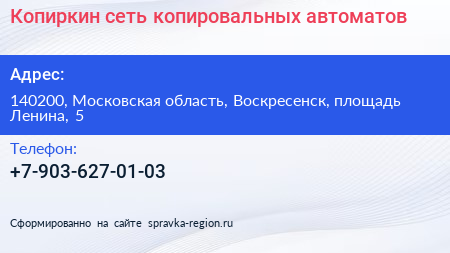 Копиркин, сеть копировальных автоматов по адресу 140200, Московская область, Воскресенск, площадь Ленина, 5 в дальнейшем Организация, размещена в следующих категориях: