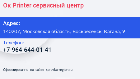 Ок Printer, сервисный центр по адресу 140207, Московская область, Воскресенск, Кагана, 9 в дальнейшем Организация, размещена в следующих категориях: