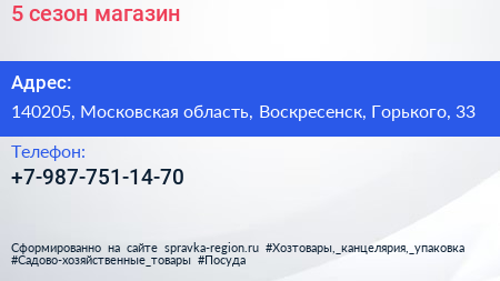 5 сезон, магазин по адресу 140205, Московская область, Воскресенск, Горького, 33 в дальнейшем Организация, размещена в следующих категориях: