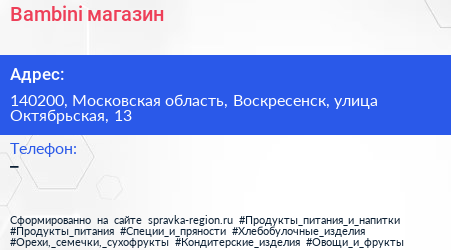 Bambini, магазин по адресу 140200, Московская область, Воскресенск, улица Октябрьская, 13 в дальнейшем Организация, размещена в следующих категориях: