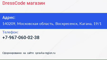 DressCode, магазин по адресу 140209, Московская область, Воскресенск, Кагана, 19/1 в дальнейшем Организация, размещена в следующих категориях: